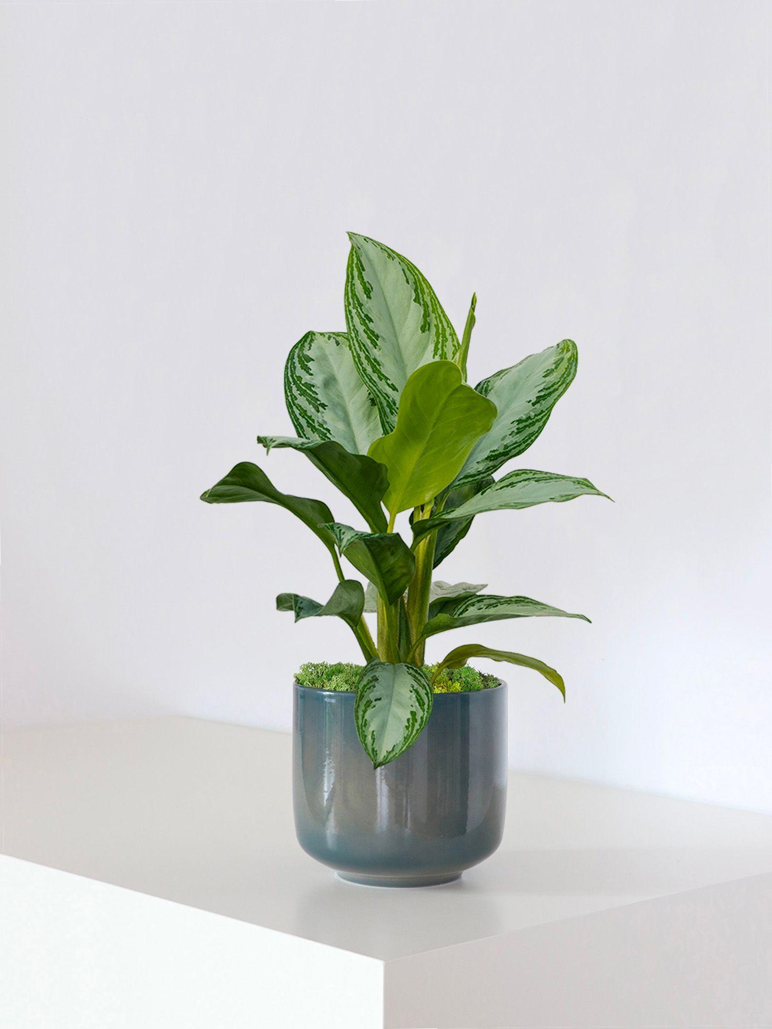 Eine üppige und farbenfrohe Pflanze mit großen silber-grünen Blättern, die sich in Bereichen mit wenig bis keinem Licht oder Belüftung wohlfühlt. Sie wird als eine der Top-Ten-Luftreinigungspflanzen der NASA aufgeführt. Auch bekannt als Chinesische Immergrüne Pflanze, wird dieser Pflanze nachgesagt, Glück zu bringen.