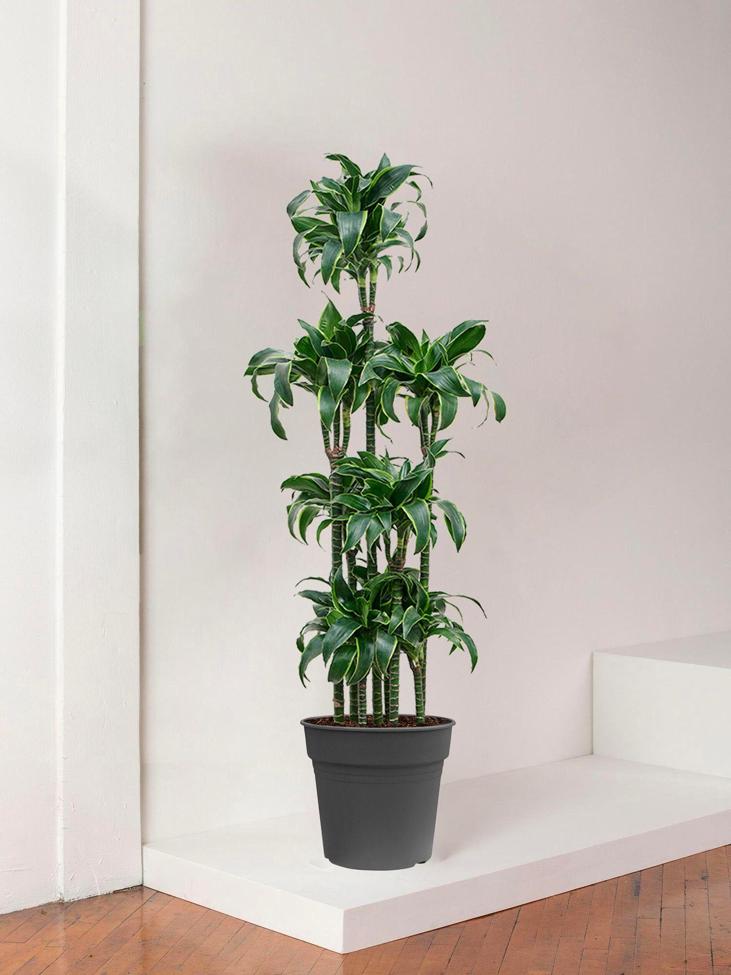 A large plant for spaces with moderate light. the Dracaena Fragrans Dorodo brings instant lushness to any space with its dark green columnar foliage. It is a very robust member of the dragon family. This plant is ideal for those looking for a large plant to add style to smaller spaces like an office.