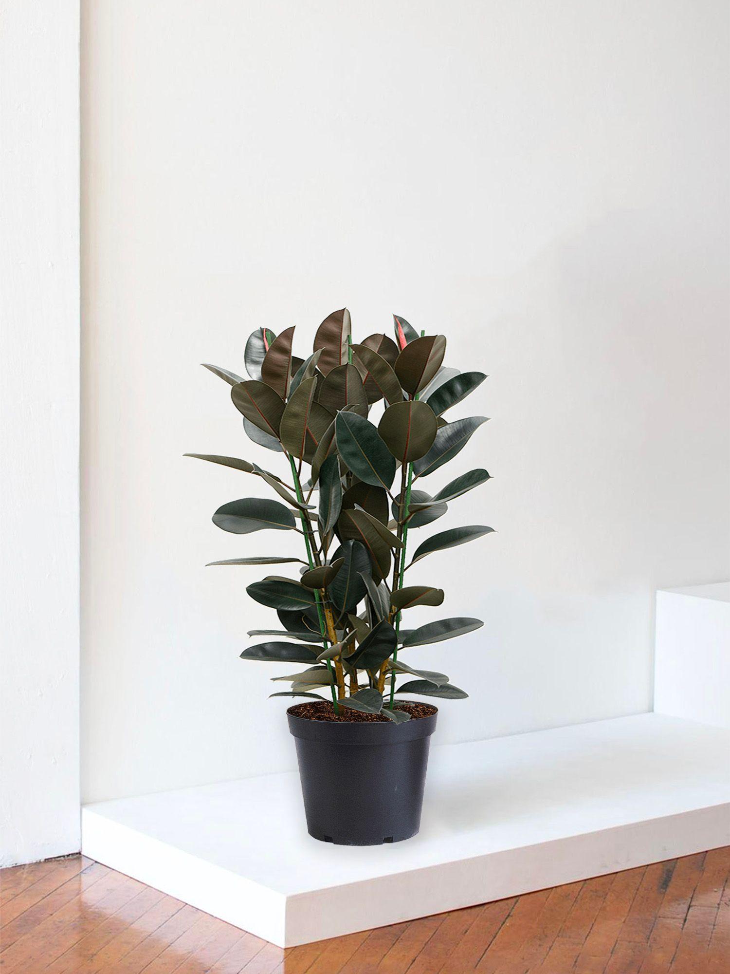 This three-stemmed rubber ficus with dark-green evergreen foliage is named for its milky latex, which was once used to produce natural rubber. In its natural habitat, this tropical plant can reach heights of up to 50 meters. Ficus Elastica is an air-purifying depolluting plant.