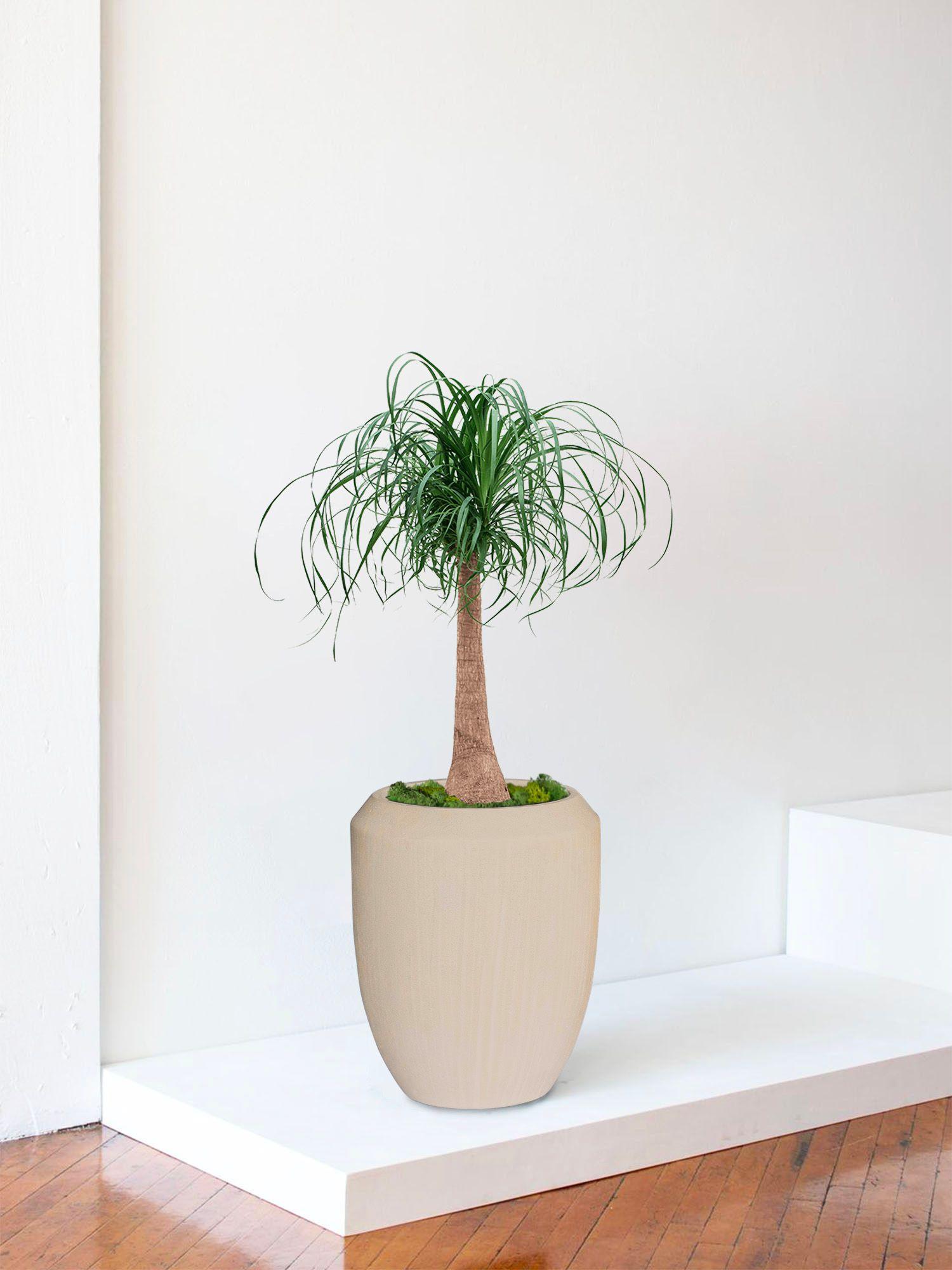 Avec sa base sculpturale et sa cascade de feuilles fines, le Pied d’éléphant (Beaucarnea recurvata) apporte instantanément du caractère à un intérieur. Il est originaire des régions arides du Mexique et s’est adapté à une vie avec peu d’eau. C’est une plante succulente qui emmagasine l’eau dans son tronc en forme de pied d’éléphant, d’où sa réputation de plante robuste et durable. Ce n’est pas un vrai palmier, mais il en a l’allure, avec un feuillage retombant qui dessine une silhouette aérienne et très décorative. En intérieur, il peut atteindre jusqu’à environ deux mètres, tout en gardant une croissance lente et élégante.