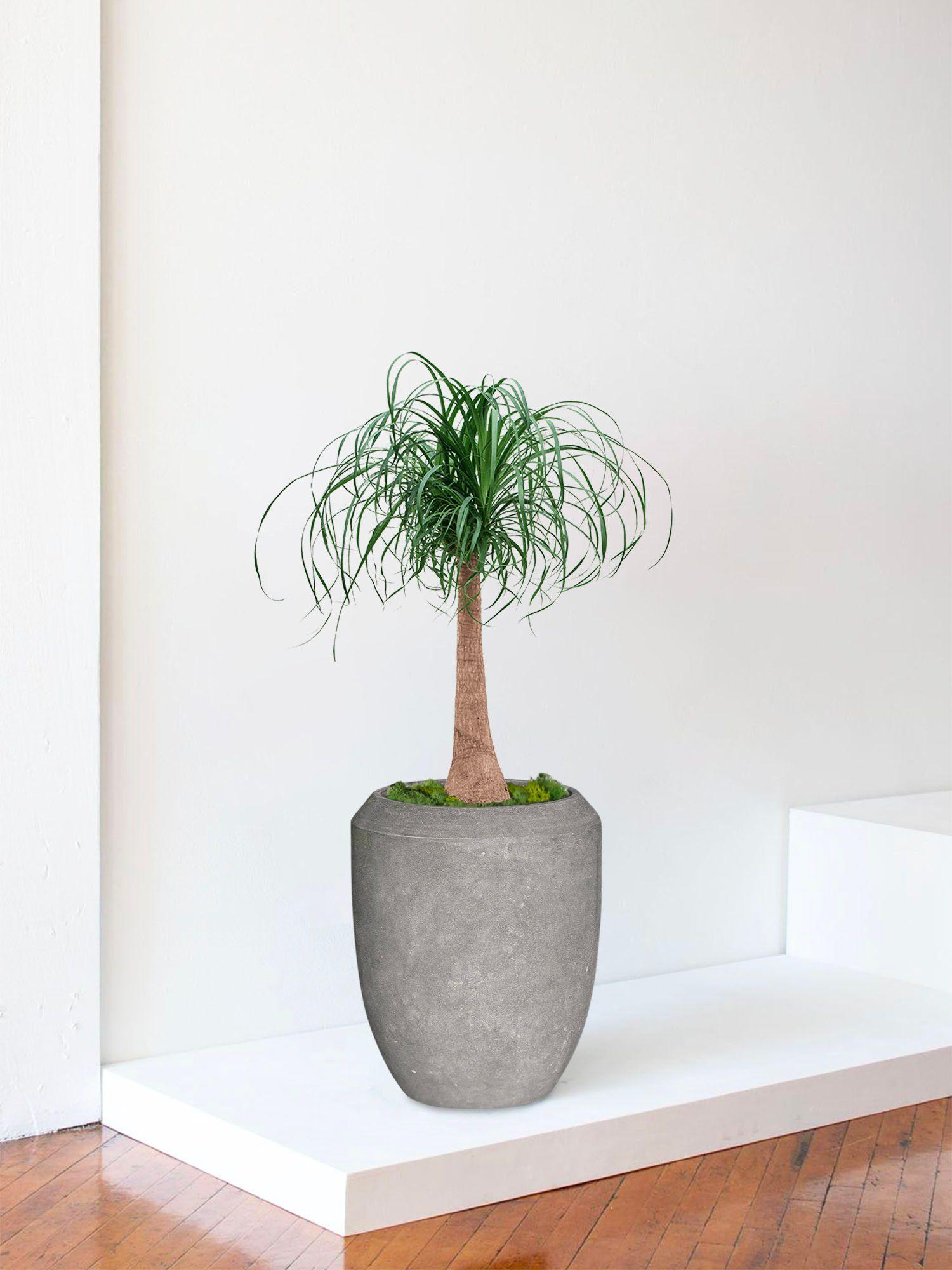 Avec sa base sculpturale et sa cascade de feuilles fines, le Pied d’éléphant (Beaucarnea recurvata) apporte instantanément du caractère à un intérieur. Il est originaire des régions arides du Mexique et s’est adapté à une vie avec peu d’eau. C’est une plante succulente qui emmagasine l’eau dans son tronc en forme de pied d’éléphant, d’où sa réputation de plante robuste et durable. Ce n’est pas un vrai palmier, mais il en a l’allure, avec un feuillage retombant qui dessine une silhouette aérienne et très décorative. En intérieur, il peut atteindre jusqu’à environ deux mètres, tout en gardant une croissance lente et élégante.