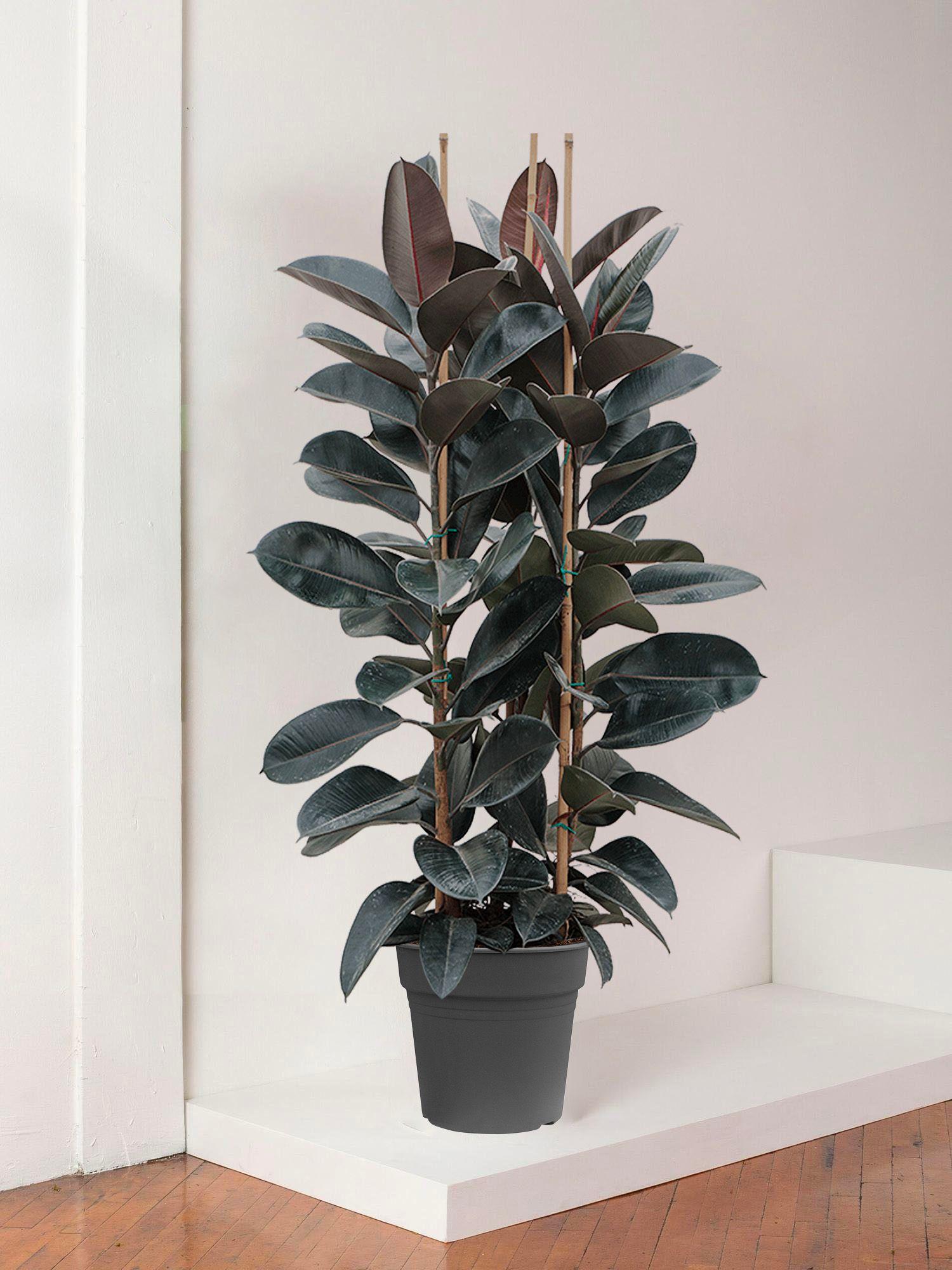 Ce ficus caoutchouc à trois tiges et au feuillage persistant vert foncé doit son nom à son latex laiteux, qui était autrefois utilisé pour produire du caoutchouc naturel. Dans son habitat naturel, cette plante tropicale peut atteindre une hauteur de 50 mètres. Le Ficus Elastica est une plante dépolluante qui purifie l'air.