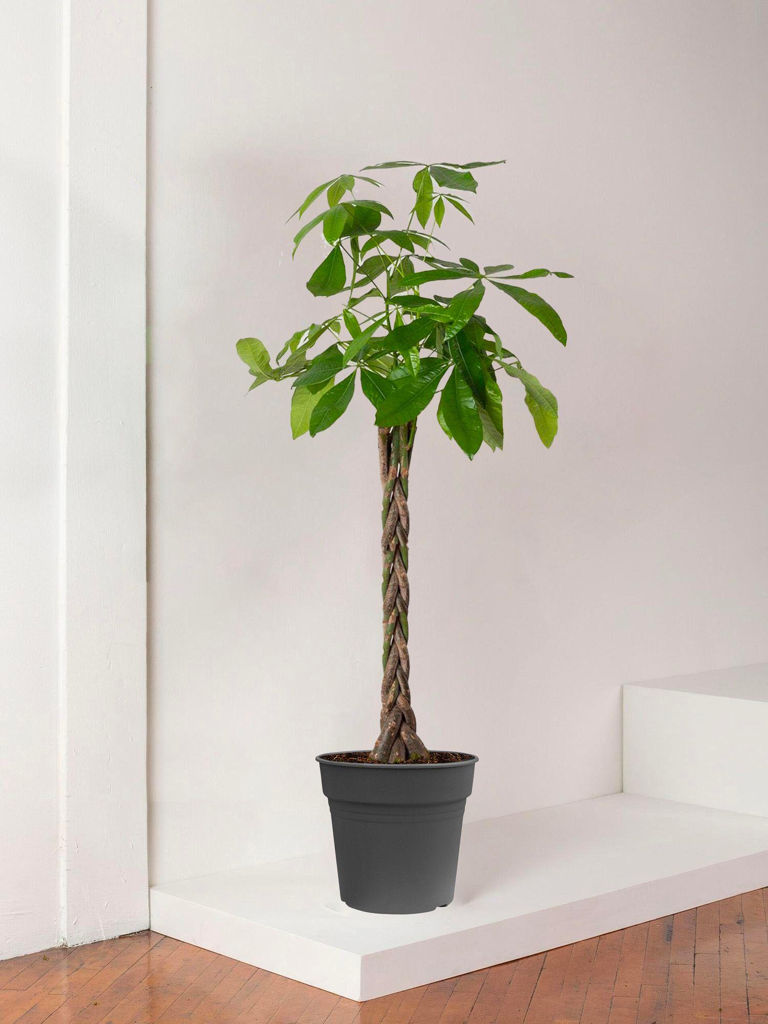 Le Pachira Aquatica, compagnon idéal car facile d’entretien, déploie de belles et grandes feuilles palmées de 5 à 9 folioles. Elles lui donnent une allure très graphique, accentuée par sa forme sensuelle de sablier et son tronc tressé bicolore symbole, en Chine, de la réussite financière !